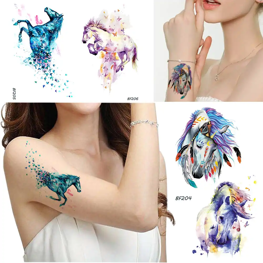 Blue Watercolor Horse Temporary Tattoo Women Butterfly