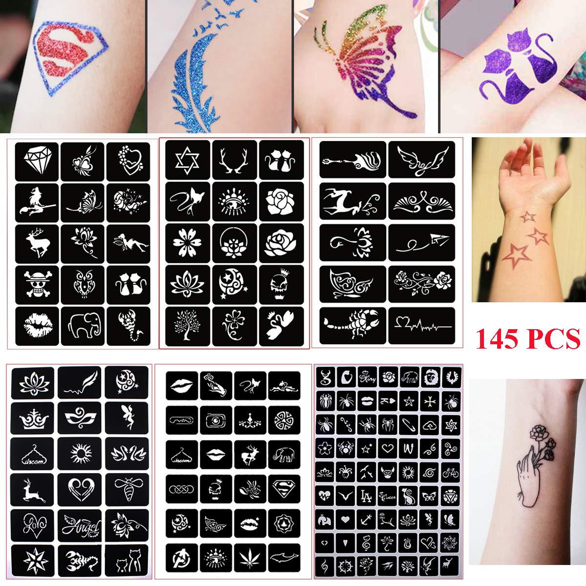Henna Tattoo Stencil Body Art Reusable Sticker Stencils Airbrush Glitter Flower Butterfly Cartoon Animals Tattoo Template 145 Designs 6 Sheet