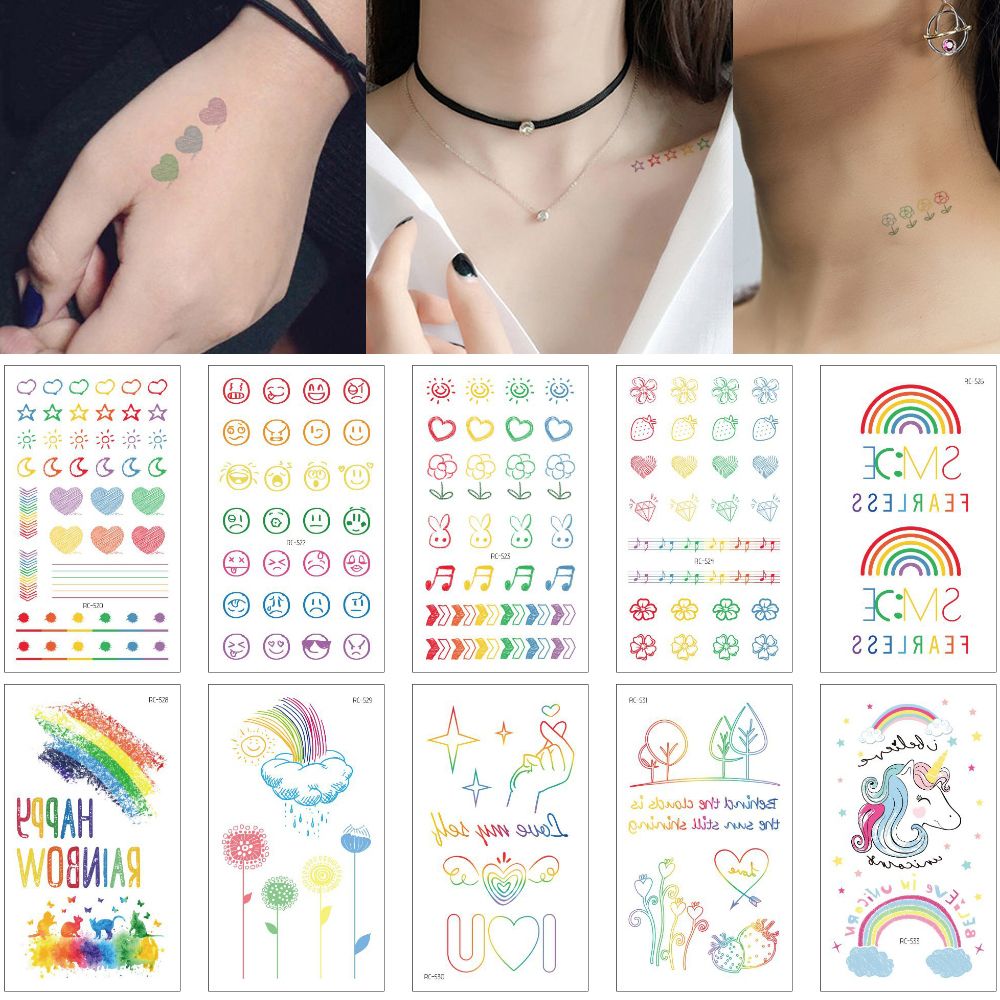 Harajuku Personalize Temporary Gradual Change Tattoo Sticker Small Flower Heart Smile Unicorn Rainbow Decal Neck Arm Body Art Tattoo Designs
